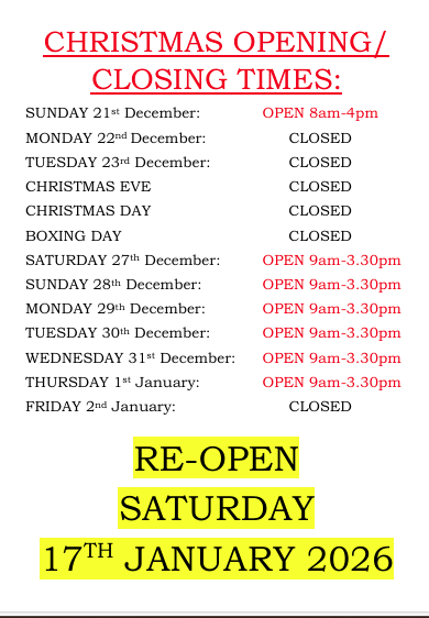 During the middle of winter we close at 4pm and the height of summer 6.30pm.